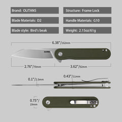 The OLITANS Rocket G067 is a compact EDC folding knife featuring a 2.75-inch D2 steel blade for excellent edge retention and hardness—ideal for outdoor cutting tasks.