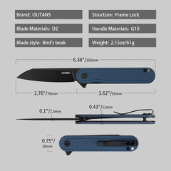 The OLITANS Rocket G067 is a compact EDC folding knife featuring a 2.75-inch D2 steel blade for excellent edge retention and hardness—ideal for outdoor cutting tasks.