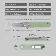 The OLITANS Rocket G067 is a compact EDC folding knife featuring a 2.75-inch D2 steel blade for excellent edge retention and hardness—ideal for outdoor cutting tasks.