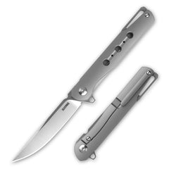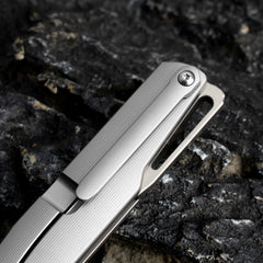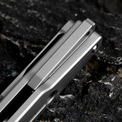 The flipper design paired with a ceramic ball bearing pivot delivers a glass-smooth, fast deployment every time. The handle, made from aerospace-grade TC4 titanium alloy, ensures a strong yet lightweight grip with a clean silver finish that evokes minimalist sophistication.